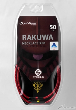 ガンダムの世界観を取り入れたメンズアパレルショップ「STRICT-G」では、ファイテン(phiten)の人気ネックレス「RAKUWA」とコラボレーションした「RAKUWAネックX50 ハイエンドIIIスリム シャアモデル」が好評発売中だ。価格は6,800円(税抜)。