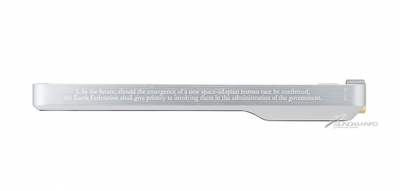 ▲本体側面に刻印されるのは、『機動戦士ガンダムUC』で重要な役割を果たす「ラプラスの箱」こと「幻の宇宙世紀憲章」の一文!