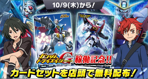 キャンペーンでは、好評放送中の『ガンダム Gのレコンギスタ』の主役機「G-セルフ」と、いよいよ本日10月8日(水)18:00より放送がスタートする『ガンダムビルドファイターズトライ』の主役機「ビルドバーニングガンダム」の2機のモビルスーツカードセットを、お店で誰でももらうことができる。