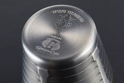 前作のステンレス製バーニアタンブラーをさらに進化させた今作は、素材に軽くて錆びず耐久性にも優れ、あらゆる金属の中で最も人体に無害な「TP270チタニウム」を採用。飲み口には高温で熱せられた金属の焼き色が、陽極酸化と呼ばれる発色加工で付けられており、艶やかで鮮やかな色合いがよりリアルな噴射口の雰囲気を醸し出す。