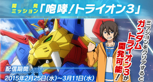 Take on the Gundam Tryon-3, the ZZZ Gundam, and the Gundam AGE-3 Normal! Clear the mission, and you'll unlock the Gunda Tryon-3 for your own use. The mission will be available through March 11th.