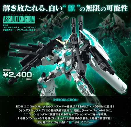 ■ASSAULT KINGDOM EX05 フルアーマーユニコーン(フルウェポン仕様) 価格:2,592円(税込) 『機動戦士ガンダムUC episode 7「虹の彼方に」』で活躍する「フルアーマーユニコーンガンダム」が、緑に輝くサイコフレームの覚醒仕様で立体化。 劇中のイメージにあわせて、本体色もグリーン系のカラーが採用されている。 【セット内容】 ○ユニコーンガンダム本体 ○フルアーマー化パーツ ○台座 ○追加オプションパーツ |
