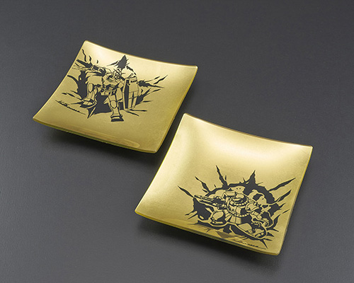 「GUNDAM 金箔ガラスプレート」は、石川県・金沢の伝統工芸品「金箔」と、メカニックデザイナー・大河原邦男氏がコラボレーションしたアイテム。大河原氏によるガンダムとシャア専用ザクの描き下ろしイラストは、金屏風に描かれる風神・雷神をイメージしたデザインとなっている。