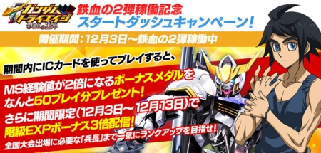 本日12月3日(木)より開催される「スタートダッシュキャンペーン」では、期間内にICカードを使用してプレイすると、MS経験値が2倍になる「ボーナスメダル」が50プレイ分プレゼントされる。開催期間は、「鉄血の2弾」稼働中。