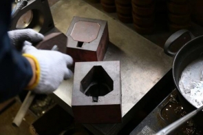 ▲原型を元にシリコン製鋳型を制作。約300℃まで熱した錫を鋳型に手作業で流し込む。