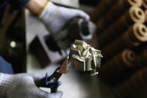 ▲錫が冷え固まったら鋳型から取り出し湯道を切り外す。職人が熟練の技で1つ1つ研鑽して仕上げる。