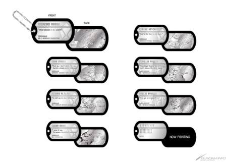 สินค้าคราวนี้จะเป็นแผ่นป้ายด็อกแท็กโลหะสลักภาพหน้าตัวละคร พร้อมเครื่องประจำตัว ด้านหลังจะสลักบทพูดในเรื่องที่แปลเป็นภาษาอังกฤษ จนกลายเป็นไอเท็มที่บอกเล่าเรื่องราวอันเข้มข้นในเรื่องได้เป็นอย่างดี สินค้าจะมาพร้อมกับไซเลนเซอร์สำหรับสวมหุ้มป้องกันไม่ให้เกิดเสียงโลหะ กระทบกันด้วย ในชุดจะมีด้วยกันทั้งหมด 8 ลายทั้งตัวละครในกลุ่มเท็กกะกัน และกาลาร์ฮอร์น ราคาจำหน่ายชิ้นละ500 เยน(ไม่รวมภาษี)