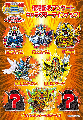 ที่บล็อก "โรบ็อตฟิกเกอร์บล็อก" ของแผนกธุรกิจบันไดคอลเลคเตอร์ส ล่าสุดได้ประกาศผลโหวต "ตัวละครที่อยากให้ทำขายเนื่องในโอกาสที่ระลึกคืนชีพต้นตำรับ SD กันดั้มเวิลด์" เมื่อวันที่ 11 เมษายน(จันทร์) ที่ผ่านมา
