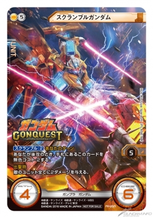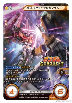 さらに、10月23日(日)に開催されるGCW初の大型イベント「JAPAN CHAMPIONSHIP 2016」にて、「GCW日本代表決定戦」とガンダムコンクエスト「第2回 全国ガンコン王選手権」の同時開催が決定。それを記念し、連動キャンペーン第3弾として「ホットスクランブルガンダム」がカード化され、イベントにて先行配布される。