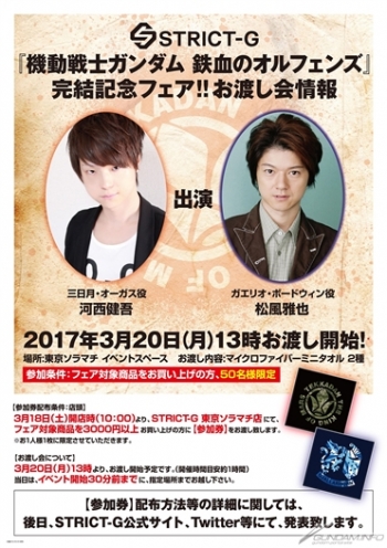 นอกจากในวันที่ 17 จะเป็นวันเปิดร้าน “STRICT-G สาขา Tokyo Solamachi” แล้ว ในวันที่ 20 ยังมีการจัด Meeting กับคุณ Kawanishi Kengo เจ้าของบท Mikazuki Augus และคุณ Matsukaze Masaya เจ้าของบท Gaelio Bauduin อีกด้วย วิธีการเข้าร่วมงานคือต้องซื้อสินค้าเป้าหมายมูลค่ารวม 3,000 เยนขึ้นไปภายในบิลเดียวในงานวันที่ 18 มีนาคมเท่านั้น จำนวนผู้ที่จะได้เข้าร่วมจำกัดไว้ที่ 50 คน