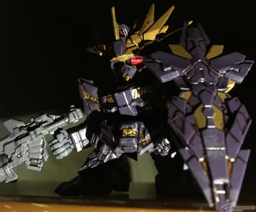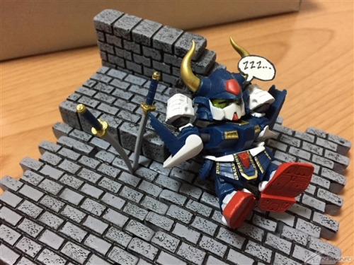 จัดท่าโพสให้เหมือนกำลังงีบหลับ แต่ก็ทำให้เหมือนมีความเคลื่อนไหว ถ้าเราพูดถึง SD Gundam, ผมคิดว่ามันควรต้องมีสติ๊กเกอร์ที่ใช้กับท่าหลับตา เลยใช้ปากกามาร์คเกอร์เขียนไปก่อน พร้อมกับเขียนบอลลูนคำพูดไปด้วยซึ่งน่าจะมีแถมเป็นสติ๊กเกอร์ให้บ้างนะ