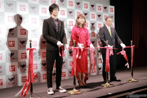 ▲เริ่มจากทางซ้าย คุณTetsuya Iwanaga, คุณRio Uchida, และตัวแทนจาก Bandai ประธานกรรมการ Masaru Kawaguchi
