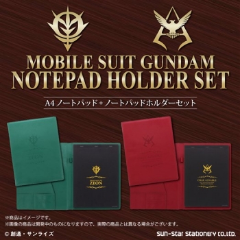 デザインは「ジオン公国」と「シャア・アズナブル」の2種類で登場。それぞれのエンブレムなどがノートパッドホルダーの表紙や中面には型押し加工で、ノートパッドの表紙には金箔押し、本文には1色印刷で施されている。