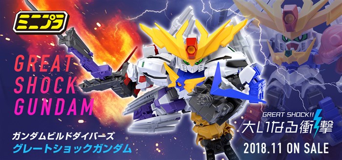 พลาสติกโมเดลซีรีส์แคนดี้ทอยแนวโรบอทและเมฉะ ซุปเปอร์เซนไต แบรนด์ “Minipla” และ “Gundam Build DIvers” ได้ร่วมมือกันผลิต "Minipla Gundam Build Divers Great Shock Gundam" วางจำหน่าย จันทร์ที่ 26 พฤศจิกายน 2018 ณ ร้านขายของเล่น, ร้านขายเครื่องไฟฟ้า และร้านค้าออนไลน์ทั่วประเทศ ในราคากล่องละ 480 เยน (ไม่รวมภาษี)