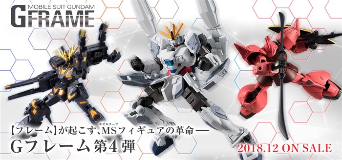 ไลน์ผลิตภัณฑ์ "Mobile Suit Gundam GFrame" นับเป็นชุดที่ 4 ที่สามารถติดตั้งเกราะลงบนเฟรมกลายเป็นฟิกเกอร์กันดั้มความละเอียดสูง วางจำหน่ายแล้ววันนี้ 24 ธันวาคม 2018 ตามร้านขายของเล่น ร้านขายเครื่องใช้ไฟฟ้า และร้านค้าออนไลน์ ราคาชิ้นละ 500 เยน (ไม่รวมภาษี)