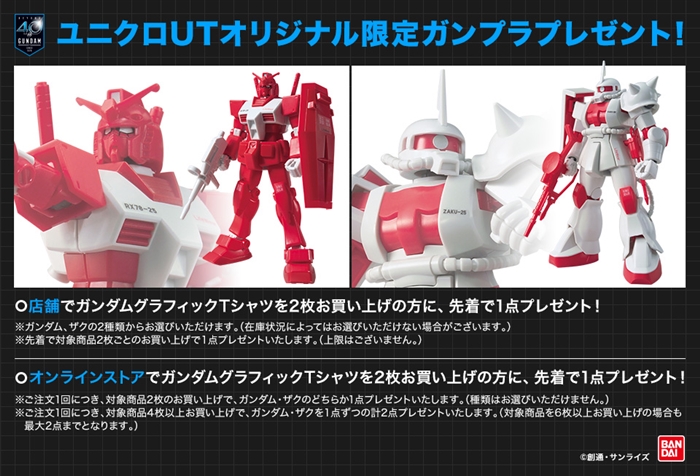 "UNIQLO UT Original Limited Gunpla" มีให้เลือกสองแบบ คือ Gundam และ Zaku จำนวนจำกัด และโปรโมชั่นนี้จะสิ้นสดลงเมื่อของหมด