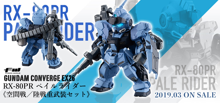 รายละเอียดที่แม่นยำของแคนดี้ทอยในไลน์ "FW GUNDAM CONVERGE" ซีรีส์ EX ได้ออกฟิกเกอร์ลำดับที่ 26 มาเป็นที่เรียบร้อยคราวนี้เป็นคิวของ "Pale Rider <Space Battle / Ground Battle Heavy Equipment Set>" เริ่มวางจำหน่ายจันทร์ที่ 25 มีนาคม 2019 ณ ร้านจำหน่ายของเล่น, ค้าปลีกเครื่องใช้ไฟฟ้า, และร้านค้าออนไลน์ทั่วประเทศ สนนราคาอยู่ที่ 2,600 เยน (รวมภาษี)