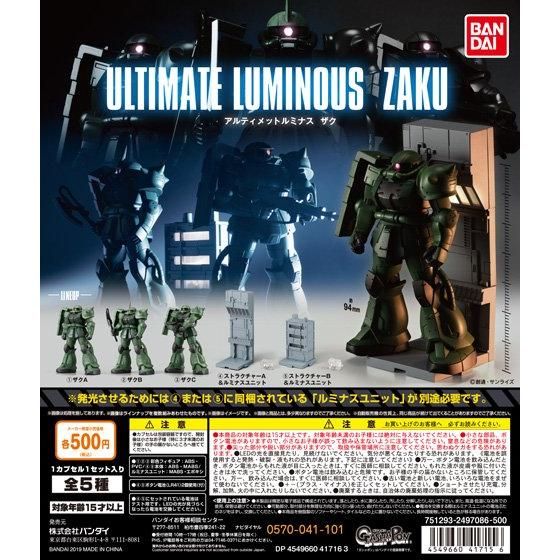 "Zaku" จาก "Mobile Suit Gundam" มาในซีรีส์กาชายอดนิยม "Ultimate Luminous" ซึ่งสามารถเปิดไฟ LED ที่ติดตั้งอยู่ใน "Luminous Unit" ของฟิกเกอร์ได้