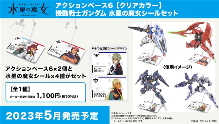 Action Base 6 [สีใส] สำหรับกันพลา (โมเดลกันดั้มพลาสติก) จาก Mobile Suit Gundam THE WITCH FROM MERCURY และสติ๊กเกอร์พิเศษ THE WITCH FROM MERCURY จะวางจำหน่ายเป็นชุดไอเทมในเดือนพฤษภาคม ราคา1,100 เยน (รวมภาษี)