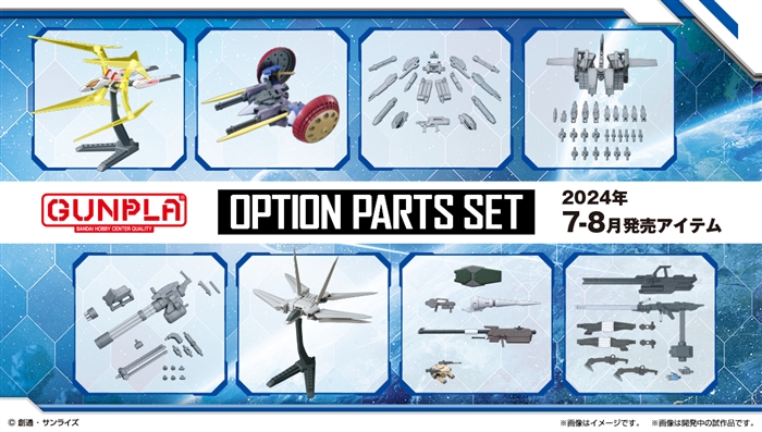 Option Parts Set GUNPLA (05 ถึง 12) ทั้งหมด 8 ชิ้น ซึ่งสามารถใช้เพื่อปรับแต่งไอเทมที่ขายแยกได้ จะวางจำหน่ายตามลำดับในเดือนกรกฎาคมและสิงหาคม