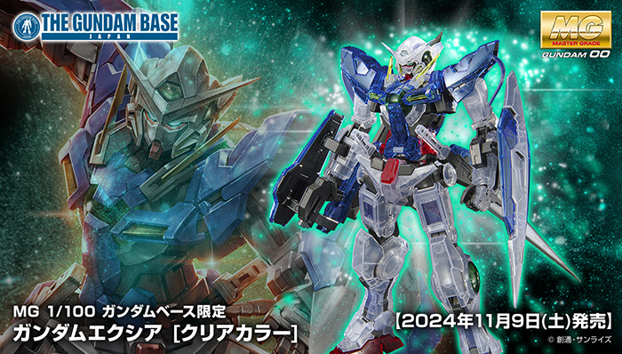 MG THE GUNDAM BASE Limited Gundam Exia [Clear Color] จะวางจำหน่ายวันเสาร์ที่ 9 พฤศจิกายน ที่ร้าน THE GUNDAM BASE สถานที่จำหน่ายกันพลาทั่วไป โดยจะวางจำหน่ายในราคา 4,180 เยน (รวมภาษี)