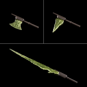อาวุธนี้มาพร้อมกับปืนกลลำแสงเฉพาะและขวานดาบลำแสงพร้อมลูกเล่นที่ยืดและหดได้ นี่เป็นครั้งแรกในประวัติศาสตร์ GUNPLA ที่อาวุธนี้สามารถสลับไปมาระหว่างโหมดต่างๆ ได้โดยไม่ต้องเปลี่ยนชิ้นส่วน และสามารถติดตั้งชิ้นส่วนเอฟเฟกต์เฉพาะได้ นอกจากนี้ยังเข้ากันได้กับส่วนประกอบจาก HG Döven Wolf, HG Sinanju และ HG Gundam TR-6 [Woundwort] Psycho Blade Custom (เวอร์ชัน A.O.Z RE-BOOT) อีกด้วย