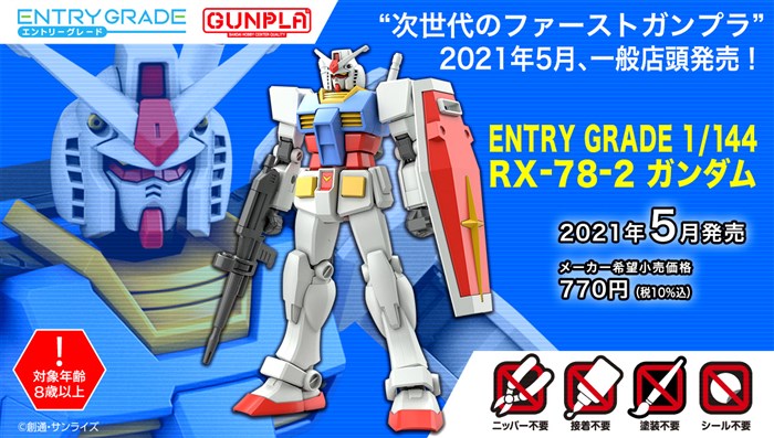 ชุด ENTRY GRADE Gundam ชุดคิทที่สามารถประกอบได้ง่ายเหมือนกับพัซเซิล จะออกวางจำหน่ายในเดือนพฤษภาคม และจะออกวางจำหน่ายราคา 770 เยน (รวมภาษี)