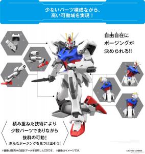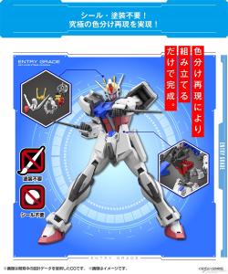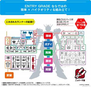 คิทนี้มีส่วนประกอบทั้งหมดเพียง 79 ชิ้น และถึงแม้ว่าจะมีขั้นตอนการประกอบที่ง่าย แต่จุดขยับที่กว้างขวางของมันทำให้สามารถโพสท่าได้หลากหลาย ENTRY GRADE Strike Gundam คือส่วนผสมของเทคโนโลยีจาก BANDAI SPIRITS Hobby Division ที่มีประสบการณ์ในการผลิตกันพลาหลากหลายเกรด