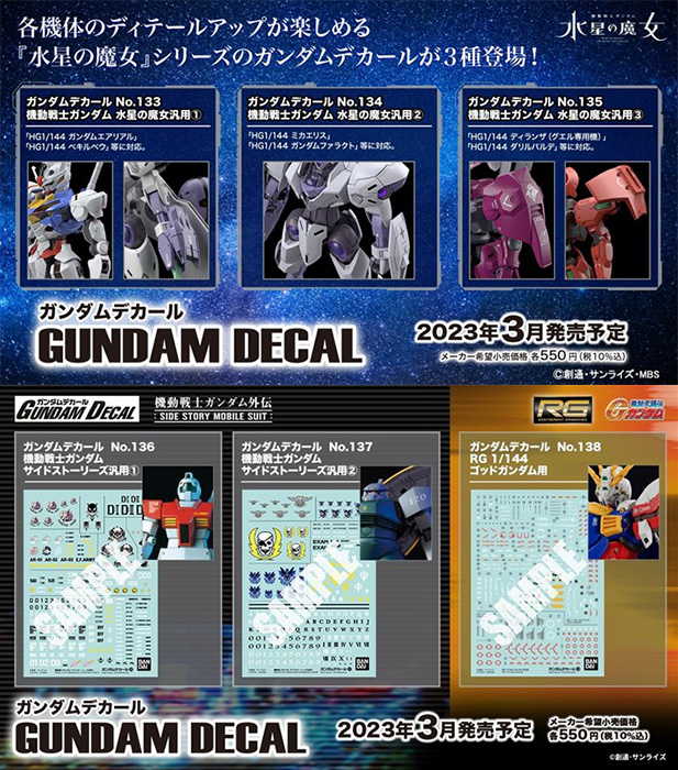 ดีคอลกันดั้มทั้ง 6 ชิ้น อาทิเช่น Mobile Suit Gundam THE WITCH FROM MERCURY Multiuseและ Gundam Decal No.137สำหรับ RG God Gundam จะวางจำหน่ายในเดือนมีนาคม 2023