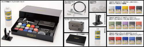 Set contents: 15-color Gundam Color set, bottle of thinner, two measuring cups with spout, compressor, airbrush, airbrush stand, custom case