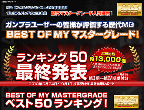 Results from the "Best Of My Master Grade" survey, held by Premium Bandai from 6/24–9/1 to celebrate the release of the MG Gundam Ver. 3.0, have been announced.