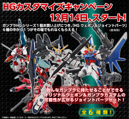 キャンペーンは、対象となるHGシリーズのガンプラを店頭で1個購入するごとに、「HG ウエポン&ジョイントパーツ」がもれなくその場で1つプレゼントされるというもの。