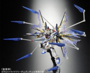 The "RG 1/144 Strike Freedom Gundam Expansion Effect Unit 'Heavenly Wings'" attaches to an RG 1/144 Strike Freedom Gundam to recreate scenes from the anime.