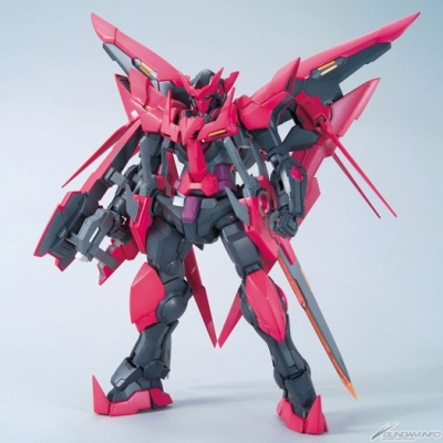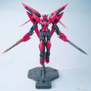 The Gundam Exia Dark Matter, Sei and Reiji's final foe in Gundam Build Fighters, joins the MG lineup. Swappable parts recreate its shattered mask from the show. The kit comes armed with its massive "Prominence Blade" and more, and its Dark Matter Booster can be separated and displayed in bird mode.