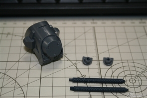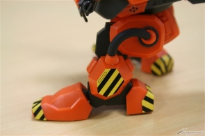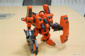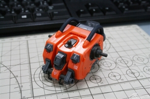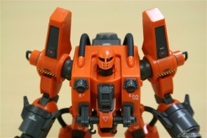 ▲まずは胴体と腰部から。背部の動力用融合炉と本体を繋ぐパイプは柔らかい合成ゴム素材でリアルに再現されている。