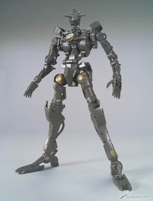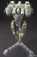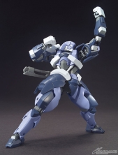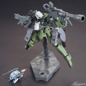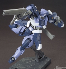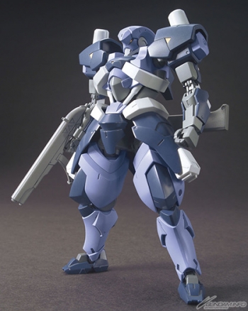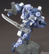 This new Mobile Suit Gundam: Iron-Blooded Orphans kit features the Graze's revised head and torso. Its back-mounter vernier nozzles can angle up and down, and its standard loadout of rifle and battle axe are included; the axe can be stowed at its hip.