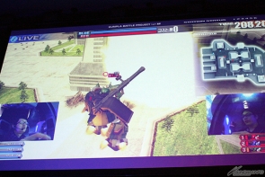 決勝戦に先立ち、司会のバロン山崎氏とバンダイナムコエンターテインメントの「戦場の絆」開発担当・正路千暁氏、バンダイ ホビー事業部の馬場俊明氏が登壇。