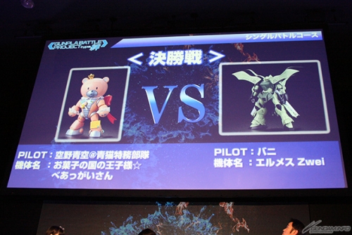 続いてはシングルバトルの決勝戦となり、空野青空@青猫特務部隊さんの「お菓子の国の王子様☆べあっがいさん」と、バニ氏の「エルメス Zwei」が対決。