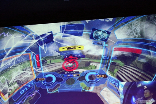 ▲一方のノブ氏、ダイスケ氏、カズマ氏のチーム「GUNPLA BOYS」は、「ZAKU II type THE SUN」、「ZAKU II type GAIA」、「ZAKU II type THE OCEAN」というザクぞろいの対照的な編成。セットしたガンプラがスキャンされると、CG化された機体が画面に映し出される。
