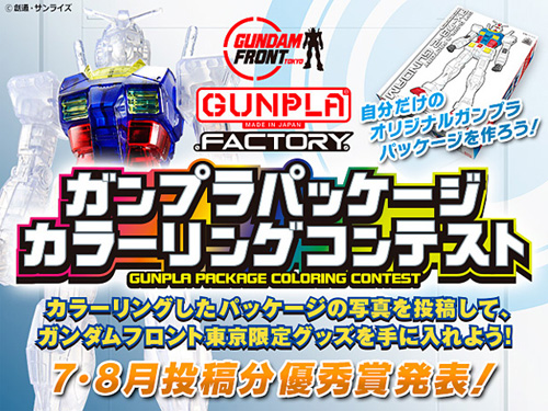 Gunpla Package Coloring Contest เปิดรับผลงานแล้ววันนี้ โดยจะเลือกผลงานชนะเลิศ 1 ชิ้นที่จะได้รับรางวัลสุดพิเศษจาก Gundam Front Tokyo ในทุกๆเดือน สำหรับใครที่สนใจ ลองไปเที่ยว Gundam Front Tokyo แล้วลองสร้างผลงานภาพแพคเกจของตัวเองกัน แล้วมาร่วมชิงรางวัลกันเถอะ