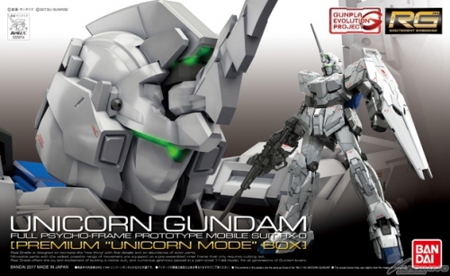 RG 1/144 Unicorn Gundam [Premium “Unicorn Mode” Box] จะวางจำหน่ายในวันที่ 5 สิงหาคม 2017 นี้ ในราคา 4,104 เยน (รวมภาษี) นับเป็นไอเทมที่ 2 ในโปรเจค GUNPLA EVOLUTION [RG Unicorn Gundam] ซึ่งมีการสร้างขึ้นโดยคำนึงถึงรูปฟอร์มและการเปลี่ยนโหมดที่สมจริงเป็นหลัก สอดคล้องกับ [EVOLUTION POINT] ในตีม “TRANSFORMATION” ที่ทะลุขีดจำกัดของสเกล 1/144 ออกไป ด้วยกลไกในระบบ “Advance MS Frame Work” ที่ทำให้เกิดกิมมิคใหม่ 3 อย่าง, มีความสเถียรในระหว่างประกอบและจุดขยับต่างๆ ที่ไปด้วยกันได้อย่างสมดุล