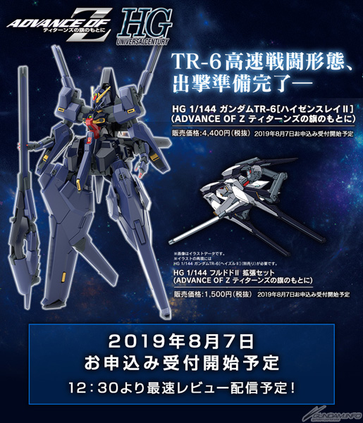จาก "ADVANCE OF Z ~The Flag of Titans~" ซึ่งเป็นไซด์สตอรี่ของ "Mobile Suit Z Gundam" มาเป็น "HG Gundam TR-6 [Haze'n-Thley II]" และ "HG Hrududu Expansion Set" เปิดให้สั่งจองในวันพุธที่ 7 สิงหาคม 2019