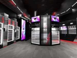 แผ่นป้ายดิจิตอลขนาดใหญ่และมอนิเตอร์หลายตัวติดตั้งอยูในร้านที่จะแสดงวิดีโอการจัดแสดงสินค้าล่าสุด