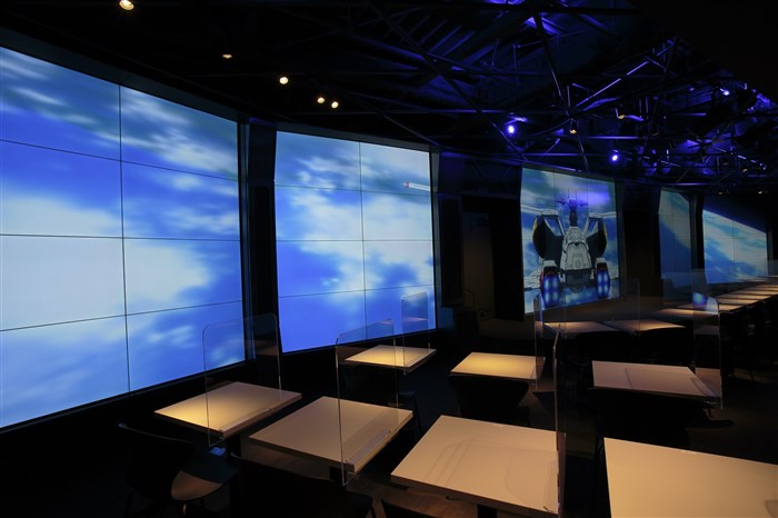เขตร้านอาหารของ GUNDAM Café ออกแบบให้คล้ายกับแคนทีนในยานรบ มอนิเตอร์ใหญ่ขนาดกว้างประมาณ 18 เมตรแสดงฉากอวกาศภายนอกเรือ ให้ผู้ชมได้ดื่มด่ำไปกับโลกแห่งกันดั้ม
