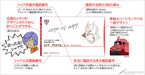 通常の名刺の3倍となる0.56mmの厚みを持つシャアの名刺は、シャアと電話できる専用回線番号が書かれているだけでなく、1辺にデザインされた定規で「計りごと(=謀)」ができたり、「実物大ザクの眼」の一部がデザインされているなど、面白い機能が多数付属!