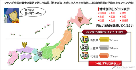 これはシャアが全国の戦士と電話で話した結果、『坊やだな』と感じた人々を点数化し、都道府県別の平均点をランキング化したもの。現在「坊や度」全国1位は島根県となっておりますが、これは名誉なことなのか、あるいは…??