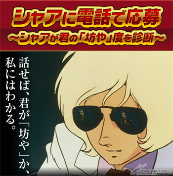 「シャア専用電話 坊や度診断」は、キャラクターと直接電話で会話ができる「ボイスワールド」(開発:バンダイナムコゲームス)と連携したサービスで、専用番号 「0570-01-0079」に携帯電話から電話をかけると、あの“赤い彗星”こと「シャア・アズナブル」につながり、会話の内容に応じて、あなたが戦場で生き残れる戦士か、それとも「坊や」か、シャアが診断してくれるというものだ。