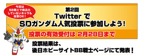 Vote by February 28th! The results will be posted on Bandai Hobby Site's BB Senshi page. Vote for your favorite SD Gundam character!