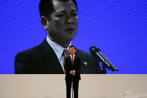 まずは株式会社SANKYOの常務執行役員営業本部長・富山一郎氏からの挨拶があり、今回発表する「フィーバー 機動戦士ガンダム」は、創通、サンライズ、そしてこれまでに多くのガンダムゲームの制作を手がけてきたバンダイナムコゲームスの全面協力の下、フル3DCGと専用筐体を採用して開発し、最高の仕上がりとなったこと、そしてガンダムという広く認知された作品で、全国をガンダム一色にしたいと意気込みを語った。
