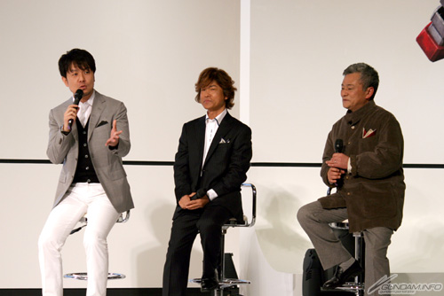アンベールの後は「ガンダム芸人」としてお馴染みの土田晃之氏を加えてトークショーがスタート。まず、ガンダムの魅力について尋ねられると、古谷氏は『富野監督が生み出した世界観、シブイ声優、あとモビルスーツのカッコよさですね』と答え、池田は『連邦とジオン、スペースノイドの思い、人の生き様といった、人間模様の描写が素晴らしい』と答えた。